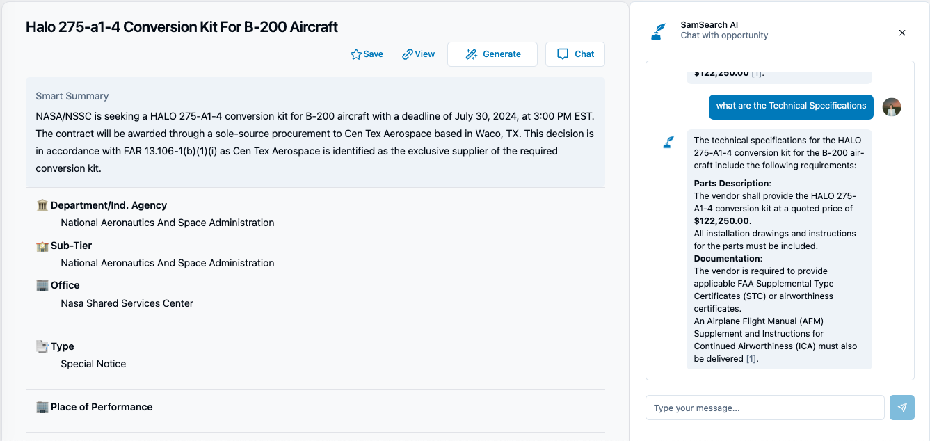 User: What are the key requirements for this cybersecurity contract?SamSearch AI: Based on the RFP, the key requirements include: 1) SOC 2 Type II certification, 2) 24/7 monitoring capabilities, 3) Incident response within 1 hour, 4) Staff with CISSP certifications, and 5) Experience with federal security standards.User: Given my company’s experience in cloud security but limited federal experience, should I bid?SamSearch AI: While your cloud security expertise is valuable, the federal experience requirement and SOC 2 certification might be challenging. Consider partnering with a federal contractor or pursuing smaller opportunities first to build federal credentials.